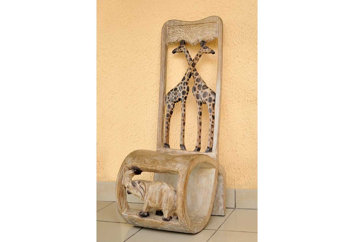 Le dossier de cette chaise est une véritable célébration de la savane, orné d’un motif saisissant de deux girafes élégantes et d’un éléphant puissant. Les girafes, avec leurs cous gracieux et leurs têtes délicates, sont sculptées avec une finesse remarquable, tandis que l’éléphant, symbole de sagesse et de force, est représenté avec une présence imposante et détaillée. Cette composition équilibrée et harmonieuse évoque la beauté et la sérénité du règne animal africain.